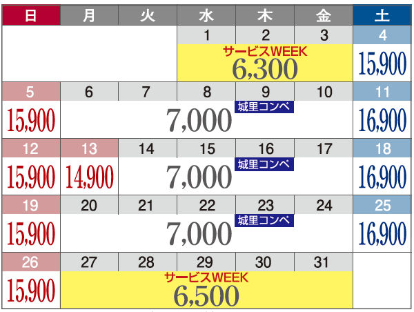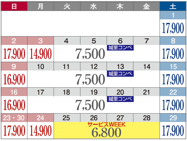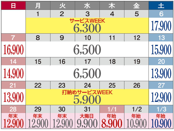 ※料金は予告なく変更となっている場合があります。また、年末年始、お盆など特日扱いの日もござい ますので、ご予約時に必ずご確認下さい。