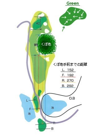 レギュラーティからティショットする場合。グリーン右手前にある大きなくぼ地が難易度を高める。フェアウェイ左サイドに打てれば問題はないが、飛距離が出る人の場合、くぼ地の方向に打つと、この深いラフのくぼ地に入る可能性が大。よって、ほとんどの人がくぼ地の手前に刻むようになるだろう。この場合は、くぼ地までの距離をしっかり把握した上でショットしたい。刻んだ場合でも、セカンドショットでくぼ地越えになる場合が多いので、ヘッドアップなどに注意して攻めていきたい。