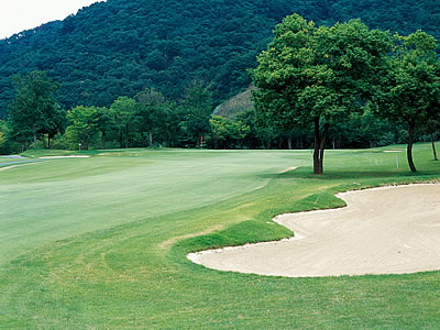 セカンドショットからやや打ち上げていくパー4。このホールでのティショットは、右サイドのクロスバンカーを気にしないで打ちたい。ただし、ティインググランドの向きが多少左に片寄っているいるせいか、ボールが左方向に飛んで行きやすいので正しいアドレスを心がけること。